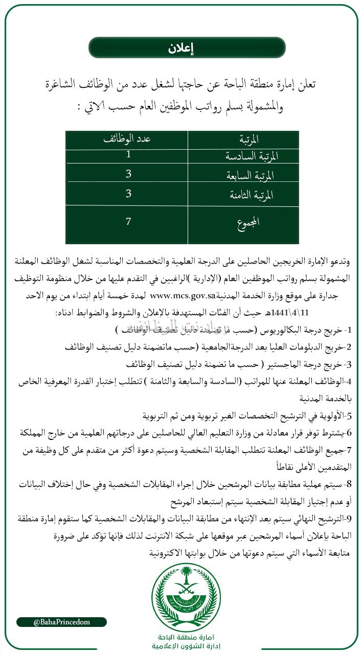 أعلنت امارة الباحة عن جاجتها لشغل عدد من الوظائف المشمولة بسلم رواتب الموظفين العام الوظائف على المراتب