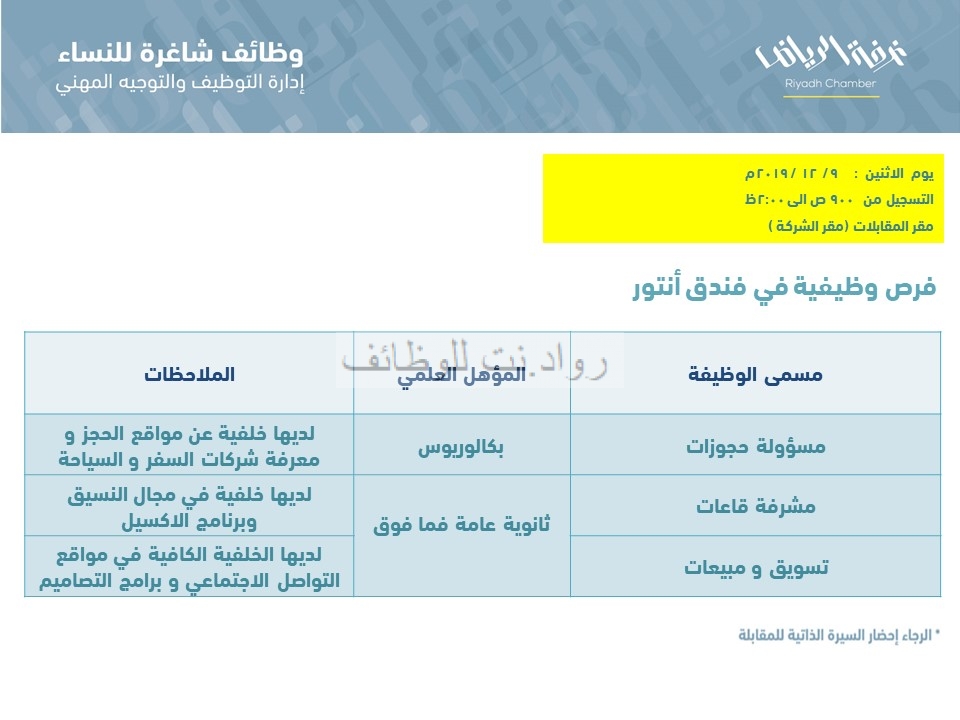 أعلنت غرفة الرياض بالتعاون مع فندق انتور عن وظائف نسائية بمسمى