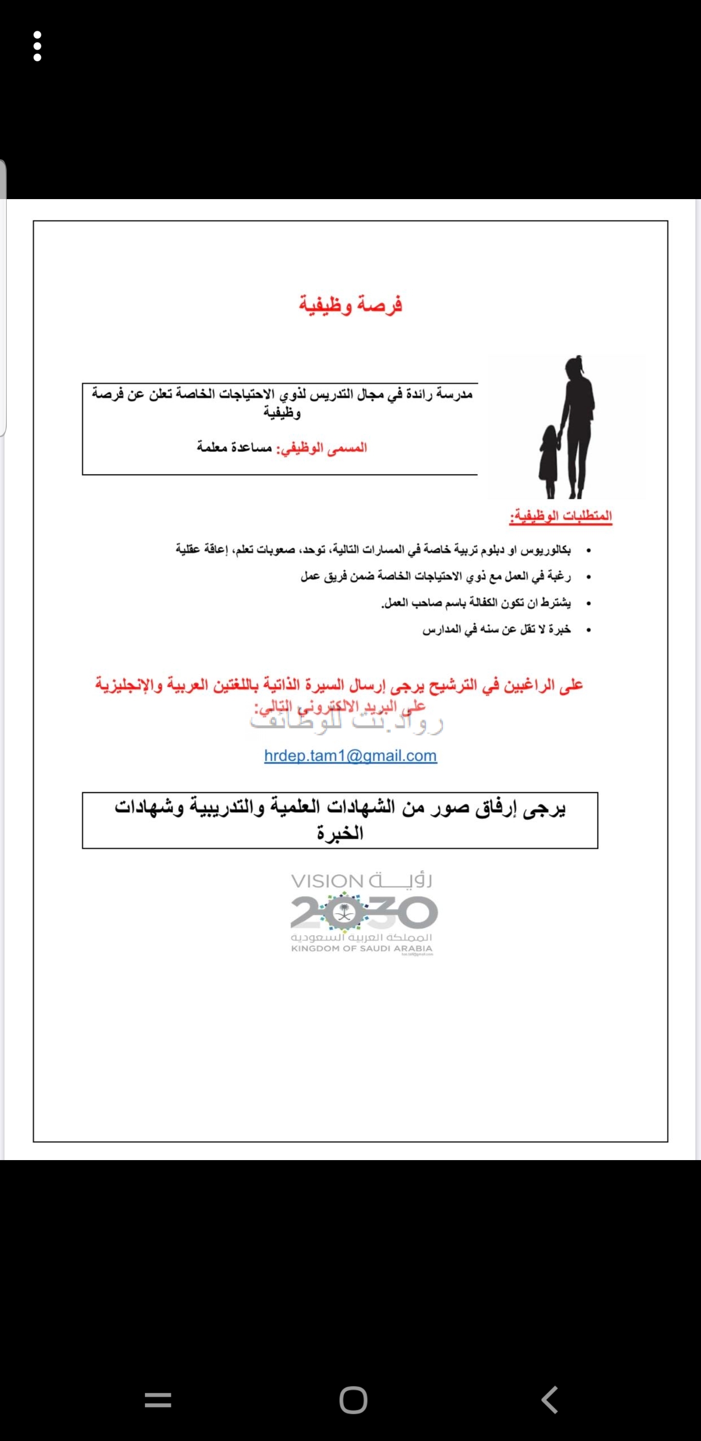 أعلنت مدرسة رائدة  في مجال تدريس ذوي الاحتياجات الخاصة عن وظيفة بمسمى
