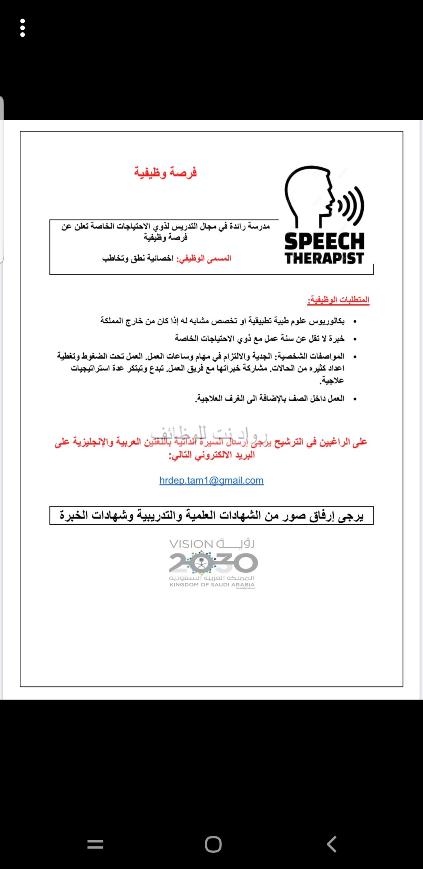 أعلنت ممدرسة تعمل في مجال ذوي الاحتياجات الخاصة عن وظيفة بمسمى اخصائية نطق وتخاطب