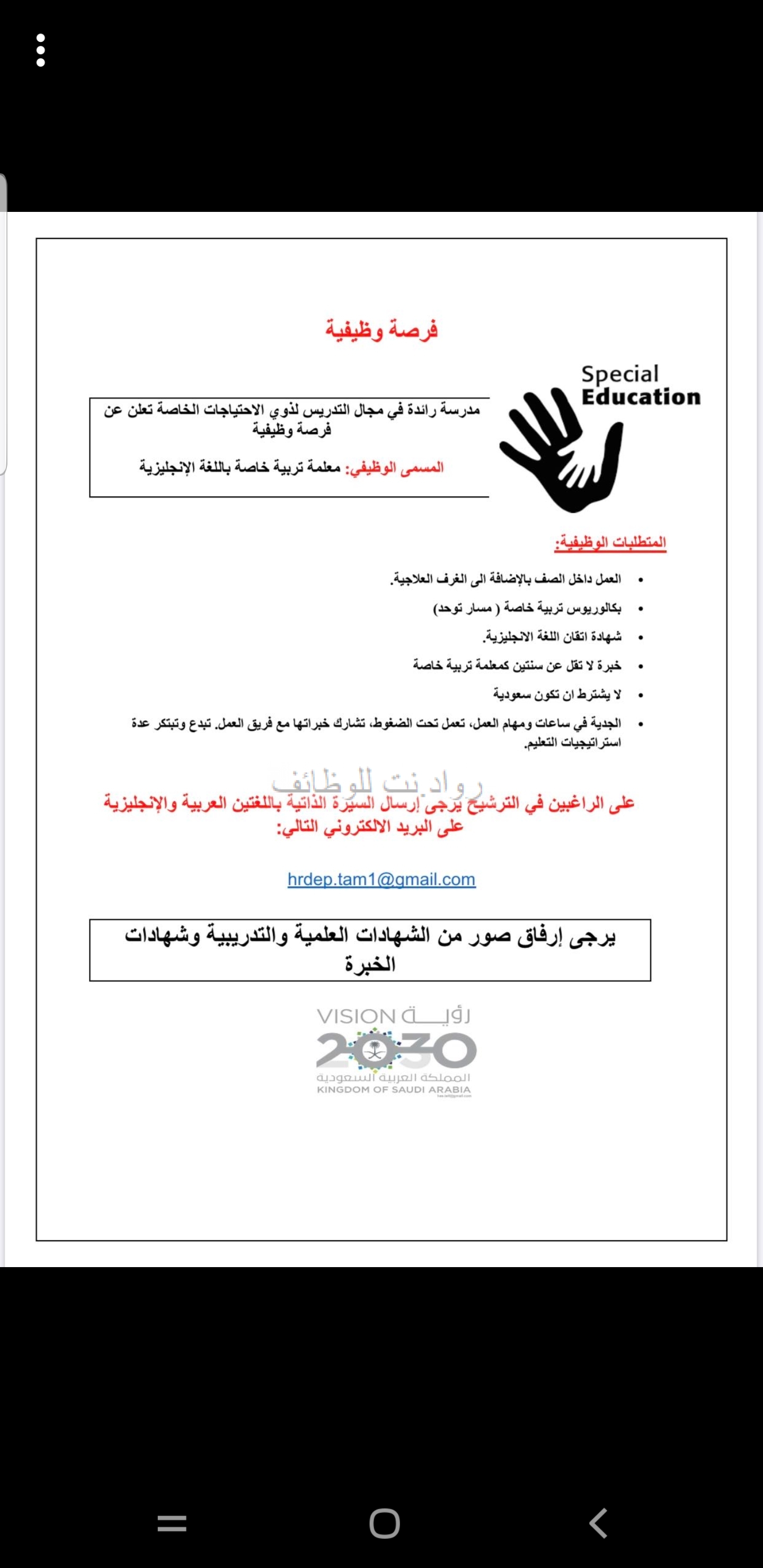 أعلنت ممدرسة تعمل في مجال ذوي الاحتياجات الخاصة عن وظيفة بمسمى معلمة تربية خاصة