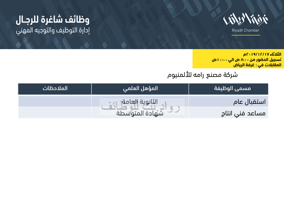 أعلنت غرفة الرياض بالتعاون مع شركة مصنع رامه للألمنيوم عن وظائف بمسمى