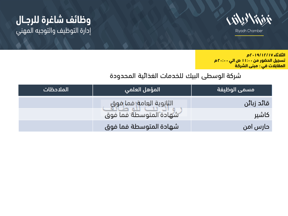 أعلنت غرفة الرياض بالتعاون مع شركة الوسطى البيك للخدمات الغذائية المحدودة عن وظائف بمسمى