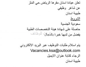 أعلنت عيادة اسنان في حي الملز عن شاغر وظيفية بمسمى