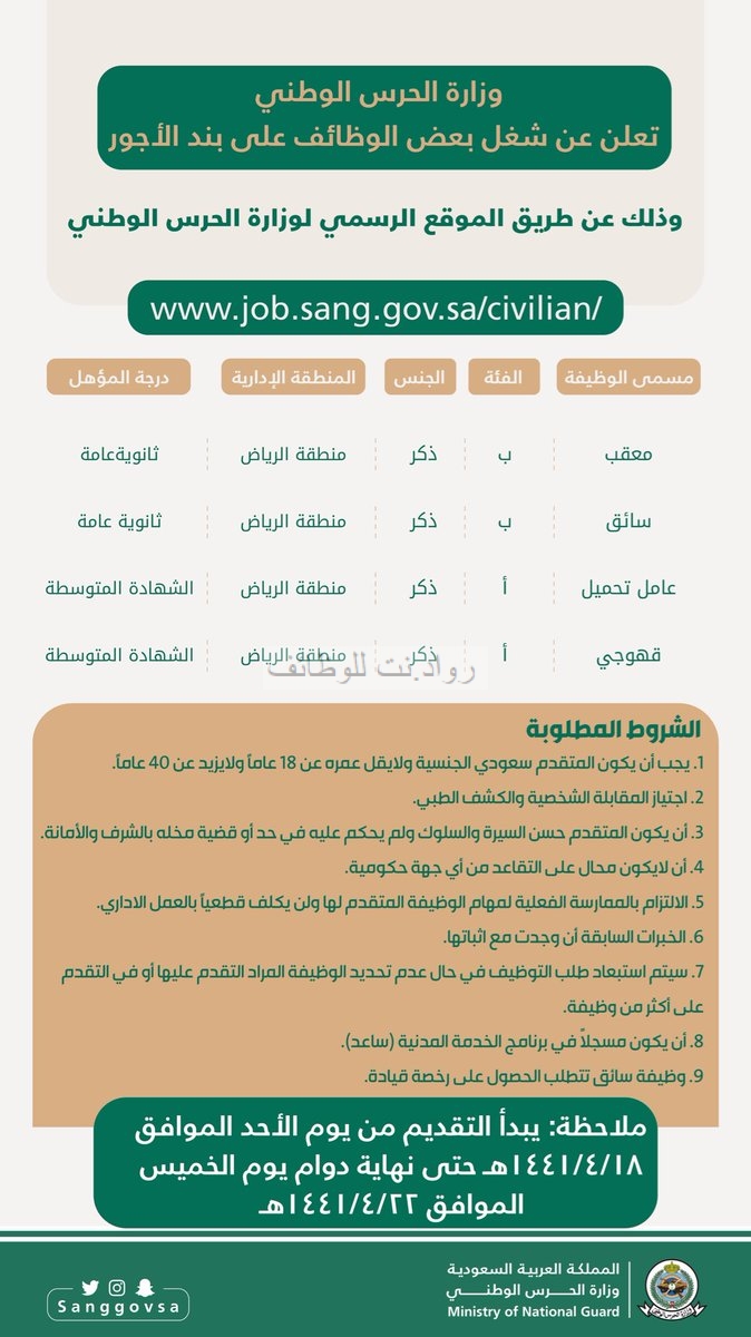 أعلنت وزارة الحرس الوطني  عن وظائف على بند الاجور في مدينة الرياض بالمسميات