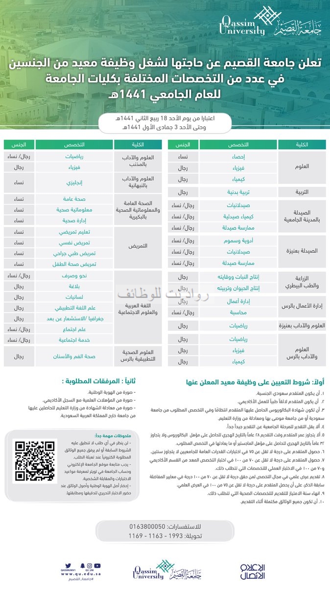 أعلنت جامعة القصيم عن حاجتها لشغل وظائف بمسمى معيد من الجنسين في عدة تخصصات وبمختلف الكليات بالجامعة