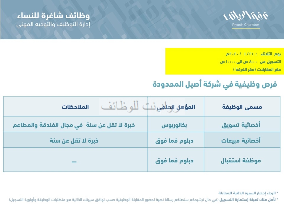 أعلنت غرفة الرياض بالتعاون مع شركة اصيل المحدودة عن وظائف بالمسميات