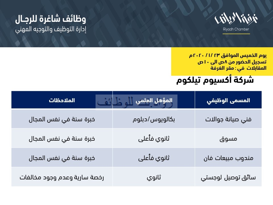 أعلنت غرفة الرياض بالتعاون مع شركة اكسيوم تليكوم عن وظائف بالمسميات