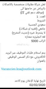 اعلنت شركة مقاولات عن وظيفة دعم فني it