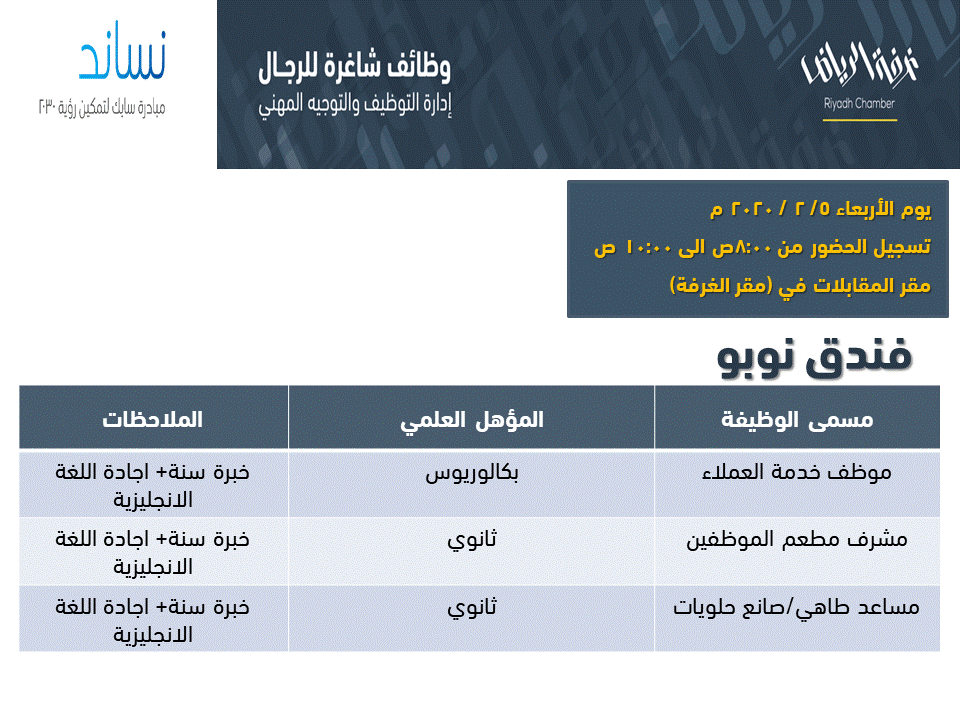 أعلنت غرفة الرياض عن وظائف بالتعاون مع فندق نوبو الوظائف بالمسميات