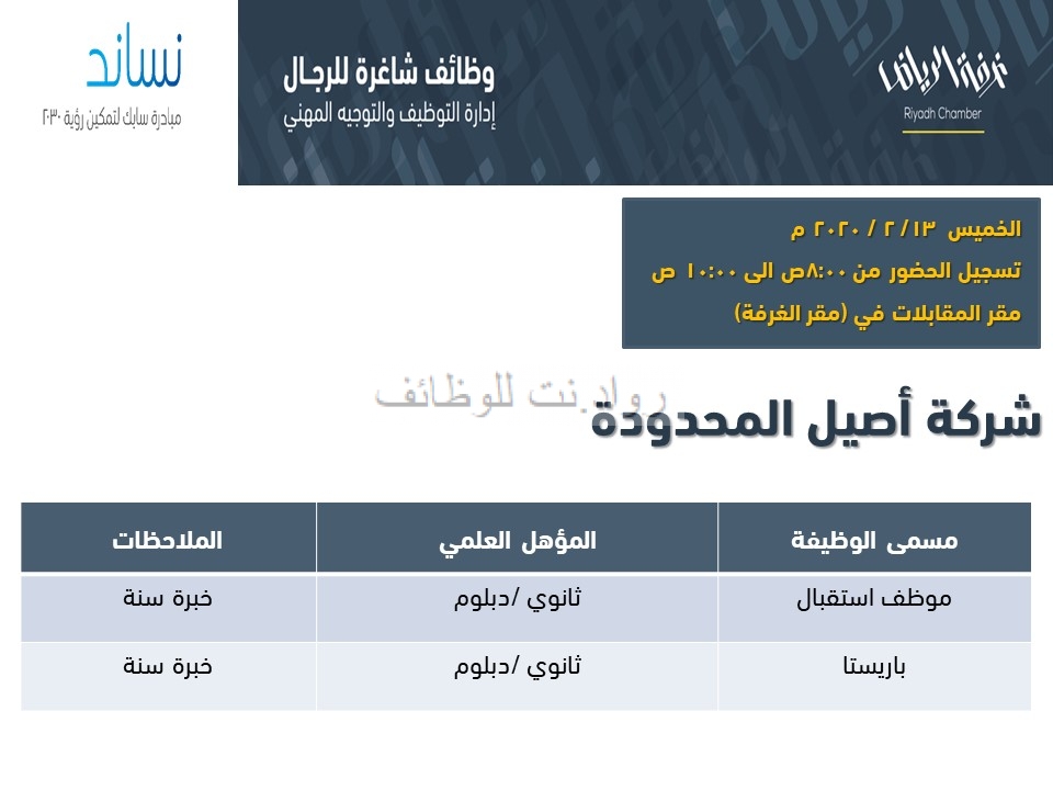 اعلنت غرفة الرياض بالتعاون مع  شركة اصيل المحدودة عن وظائف بمسمى