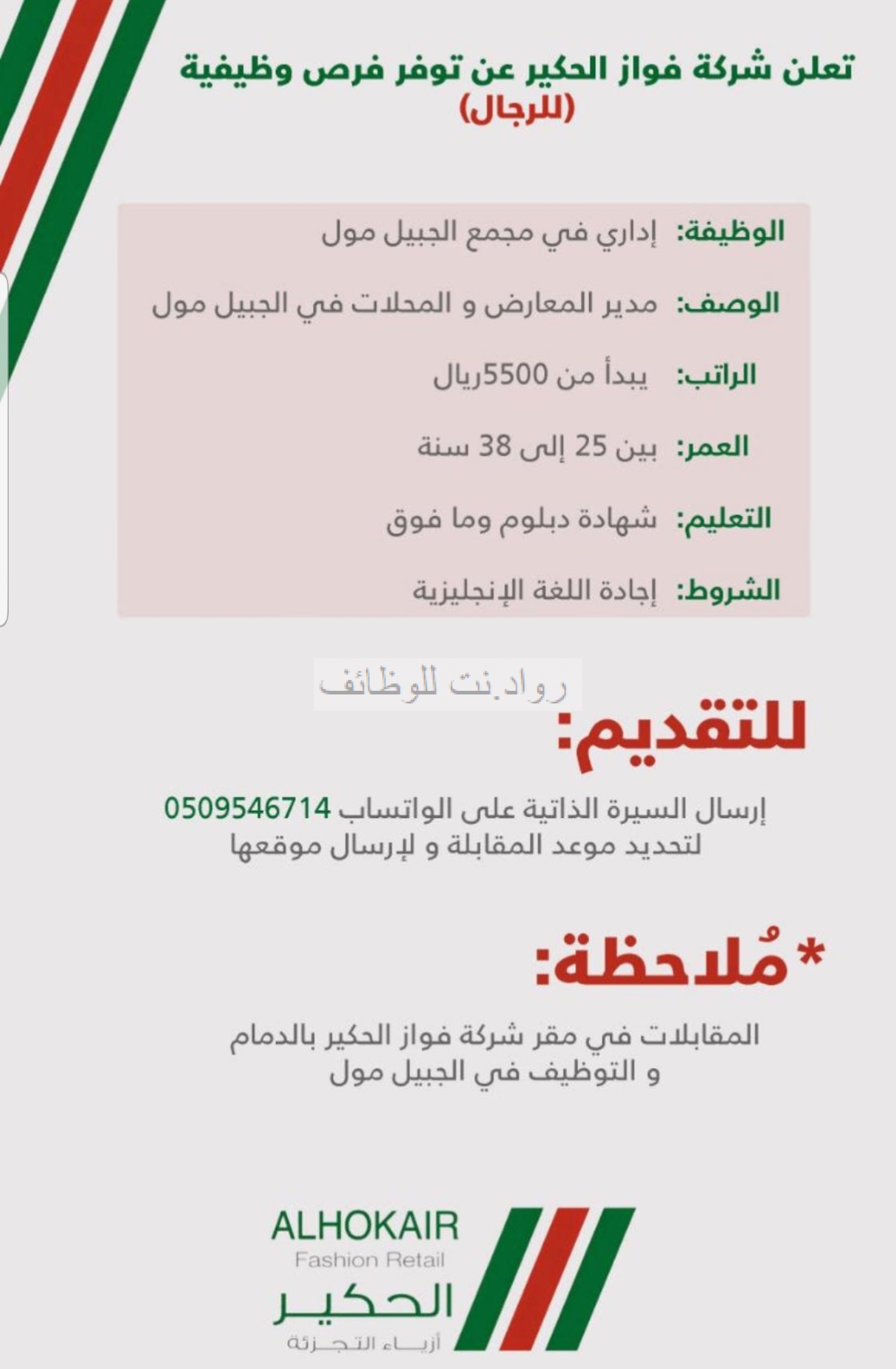 تعلن فواز الحكير عن وظائف رجالية في الجبيل بمسمى