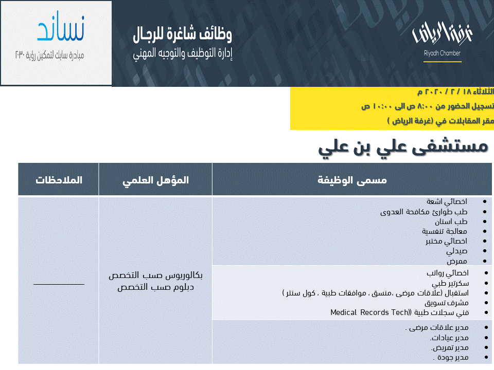 اعلنت غرفة الرياض بالتعاون مع مستشفى علي بن علي عن وظائف صحية وإدارية بأعداد كبيرة