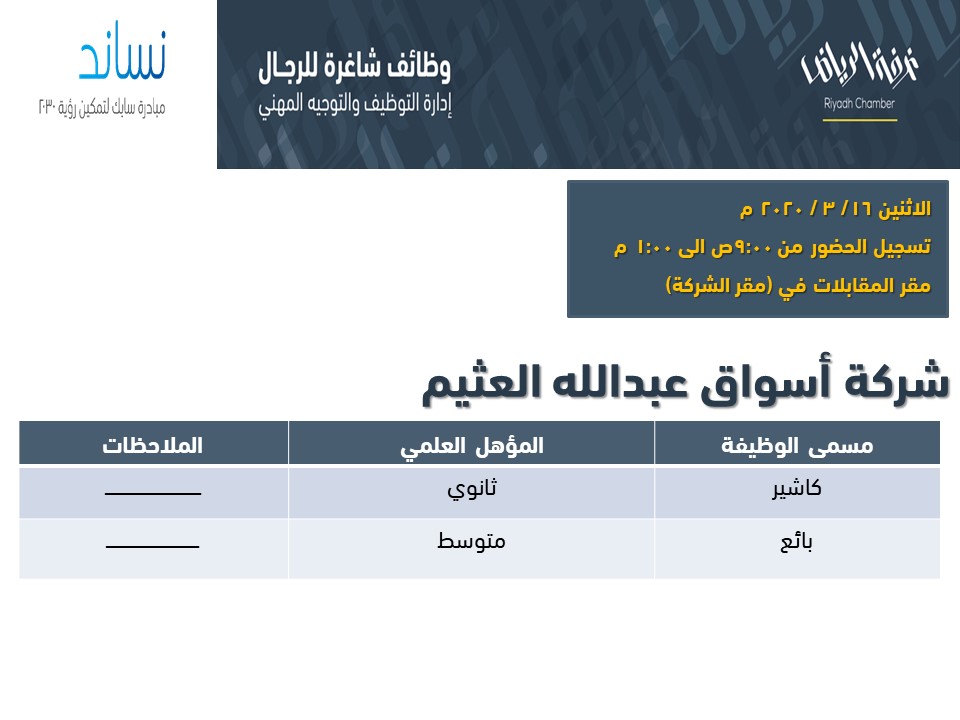 أعلنت غرفة الرياض بالتعاون مع  شركة اسواق العثيم عن وظائف بمسمى
