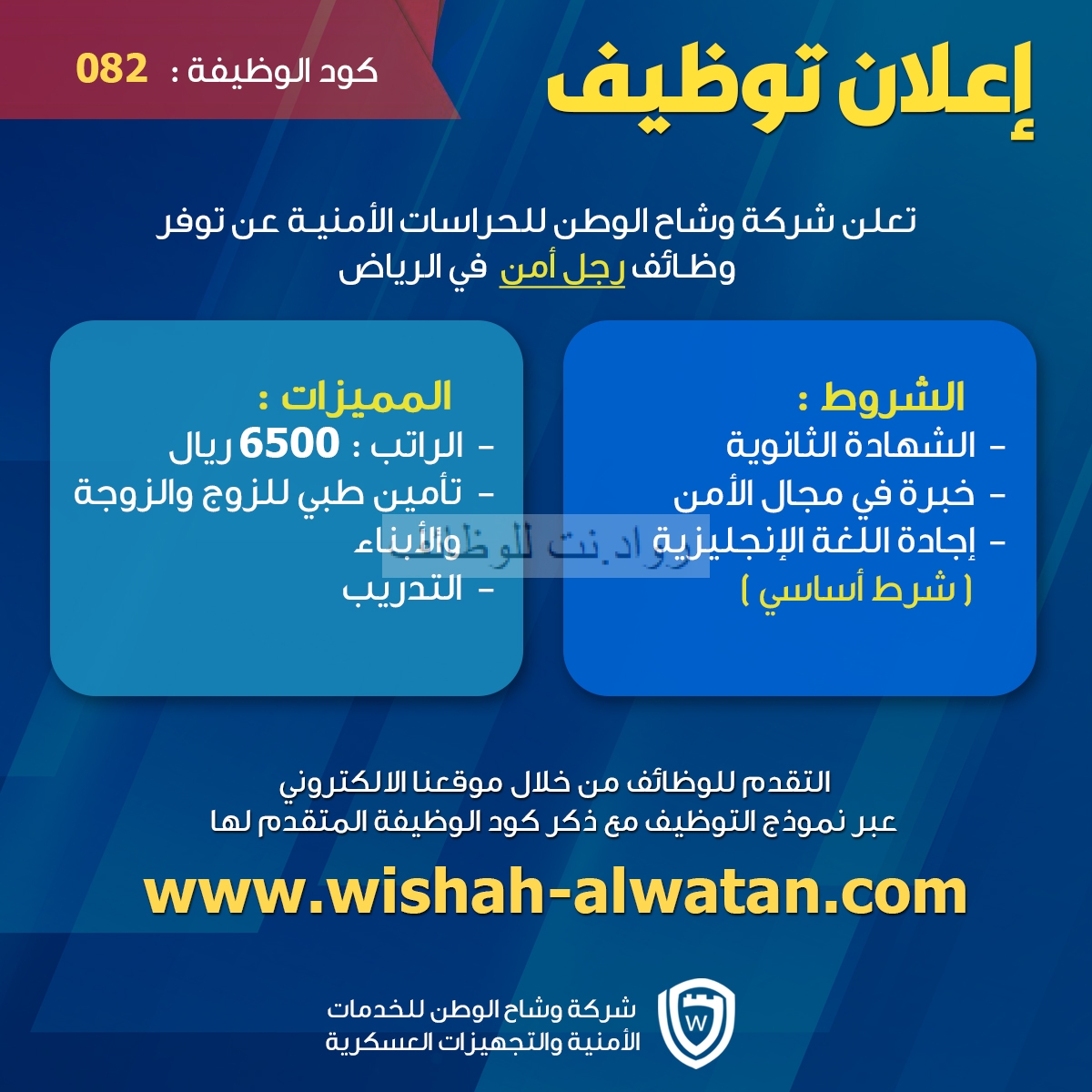 شركة وشاح الوطن وظائف رجال أمن براتب 6500 ريال لحملة الثانوية في الرياض