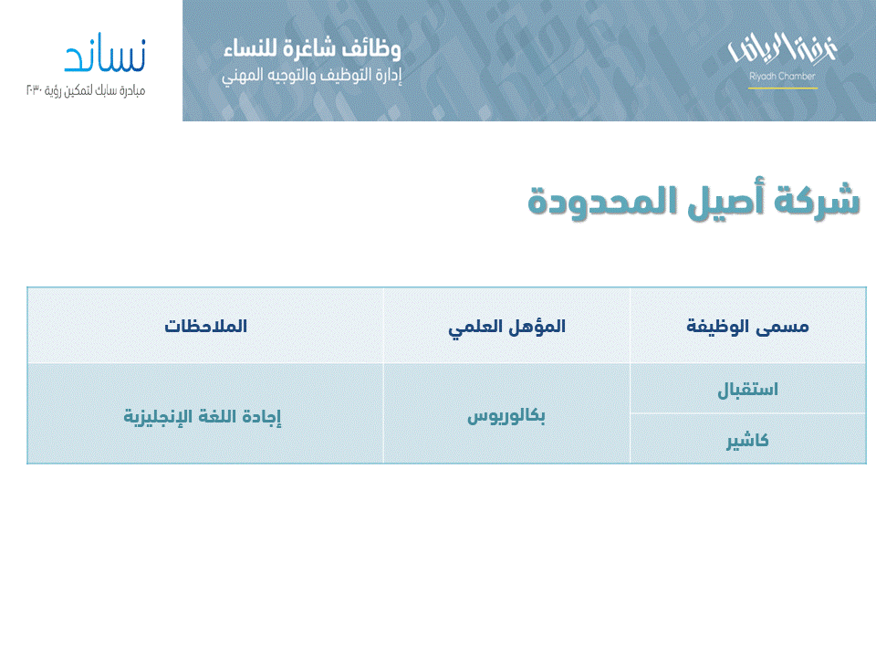أعلنت غرفة الرياض بالتعاون مع شركة أصيل المحدودة عن وظائف نسائية بالمسميات التالية