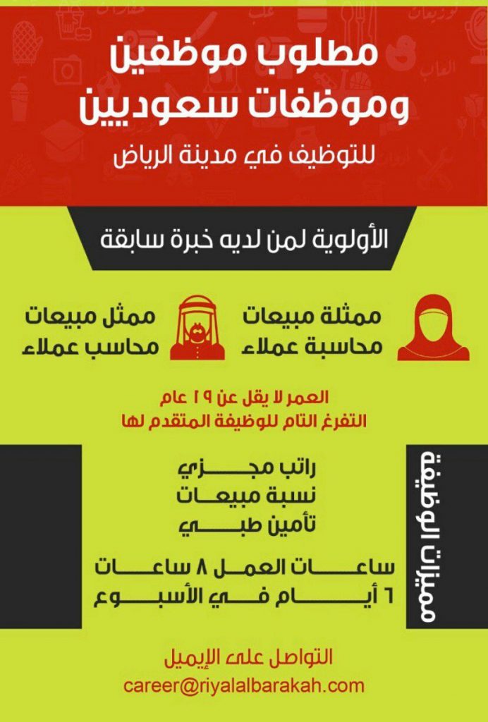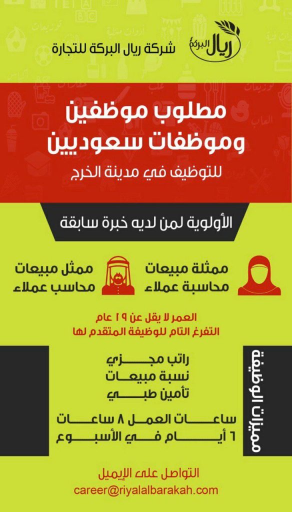 أعلنت ريال البركة عن وظائف نسائية ورجالية في الرياض والخرج بالمسميات التالية