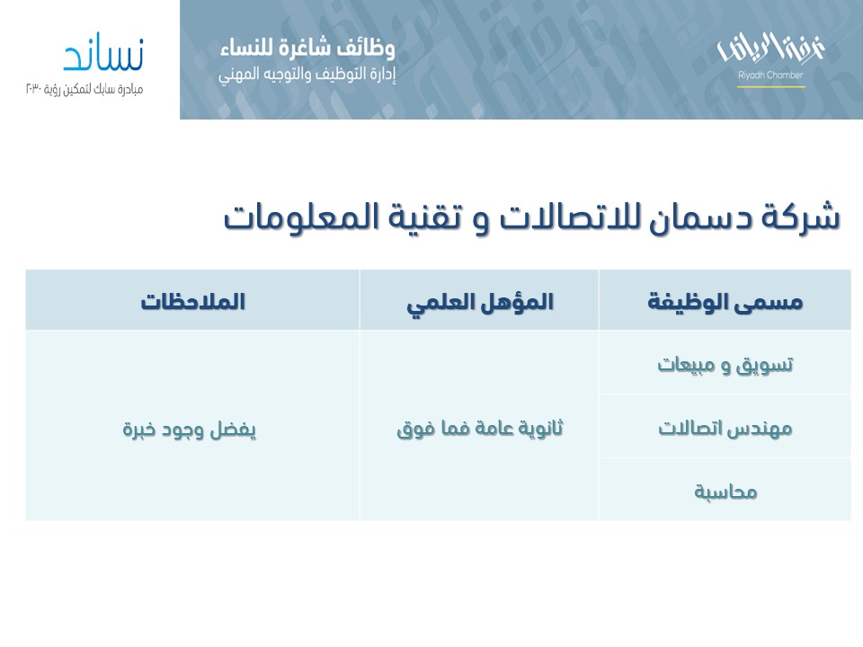 أعلنت غرفة الرياض بالتعاون مع شركة دسمان للاتصالات عن وظائف نسائية بالمسميات التالية