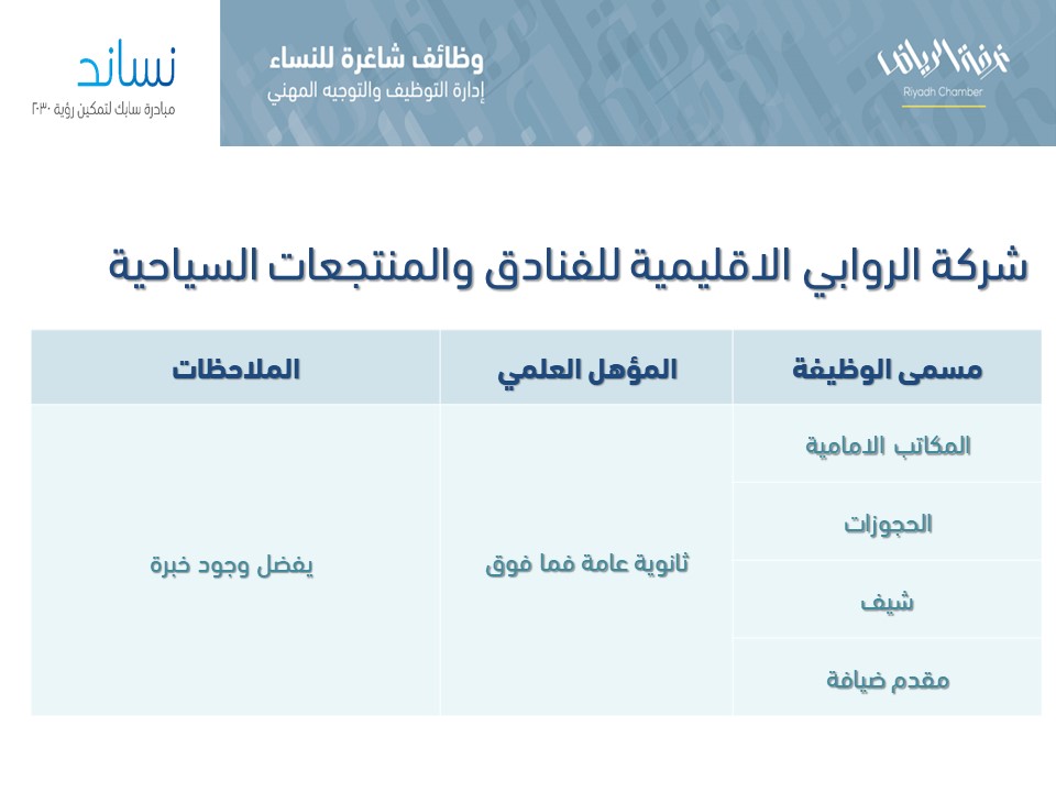 أعلنت غرفة الرياض بالتعاون مع شركة الروابي الاقليمية للفنادق والمنتجعات السياحية عن وظائف نسائية بالمسميات التالية