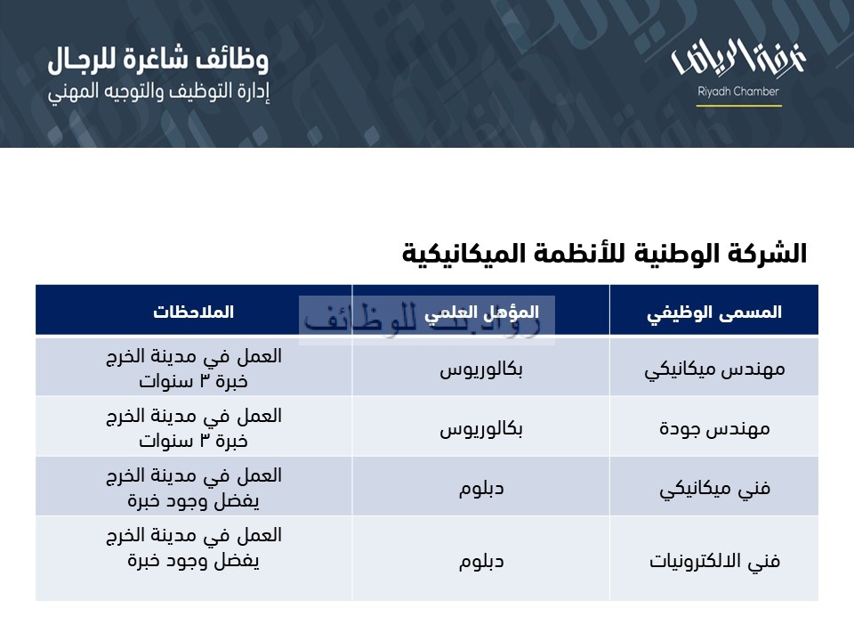 في أحدث وظائف غرفة الرياض أعلنت الشركة الوطنية للأنظمة الميكانيكية عن وظائف بالمسميات