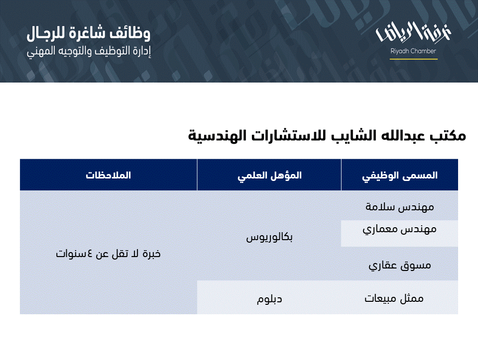 في أحدث وظائف غرفة الرياض أعلنت مكتب عبدالله الشايب عن وظائف بالمسميات