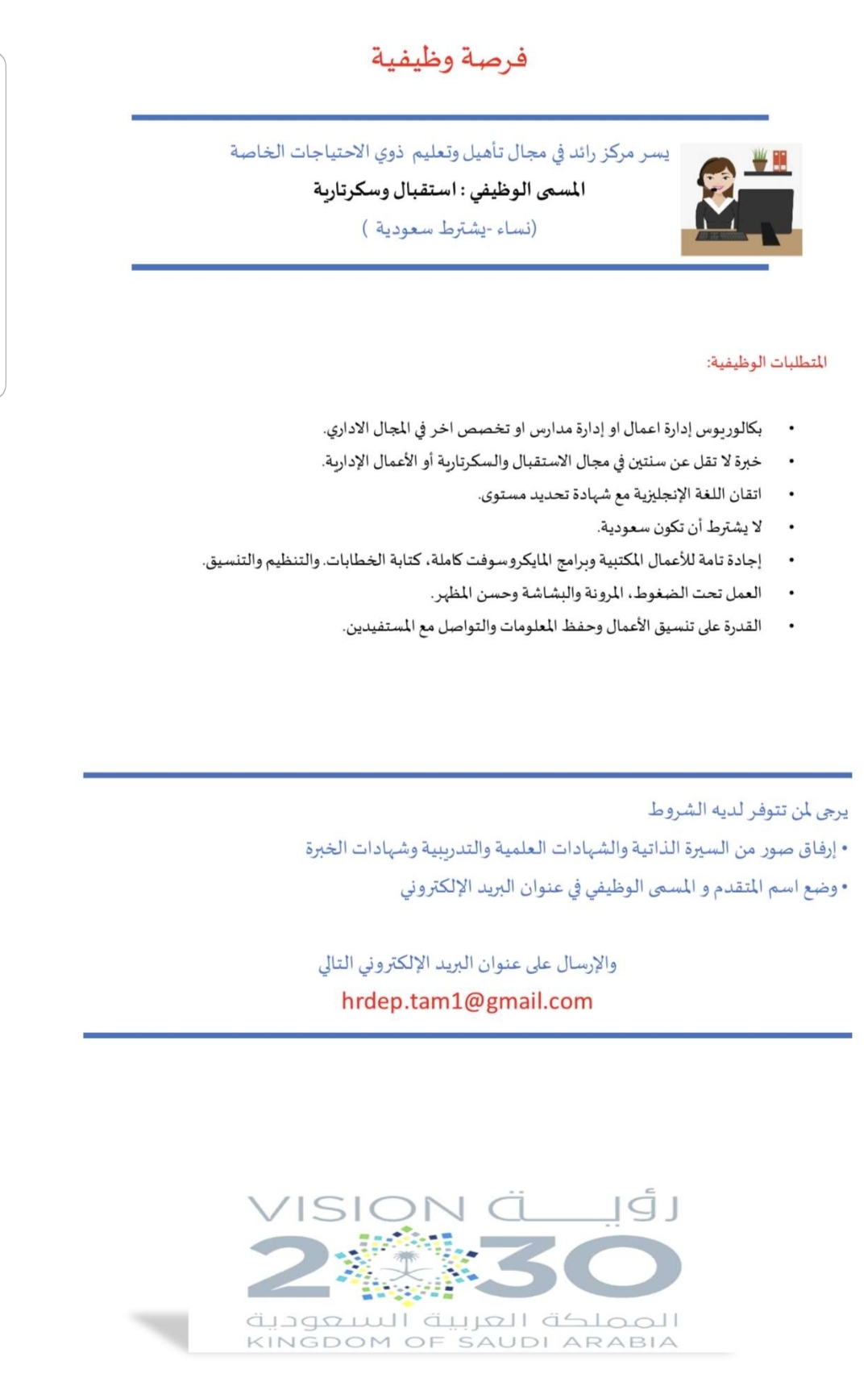 أعلن مركز يعمل في مجال تأهيل ذوي الاحتياجات الخاصة عن وظيفة بمسمى استقبال وسكرتاريه ويشترط