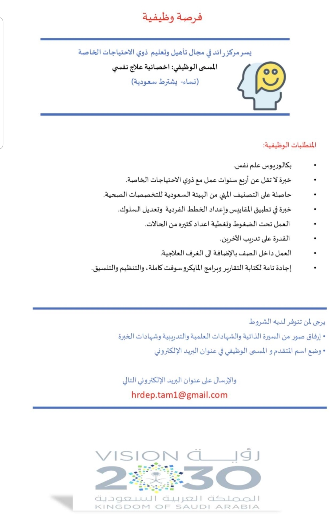 أعلن مركز رائد في مجال تأهيل وتعليم ذوي الاحتياجات الخاصة عن وظيفة بمسمى