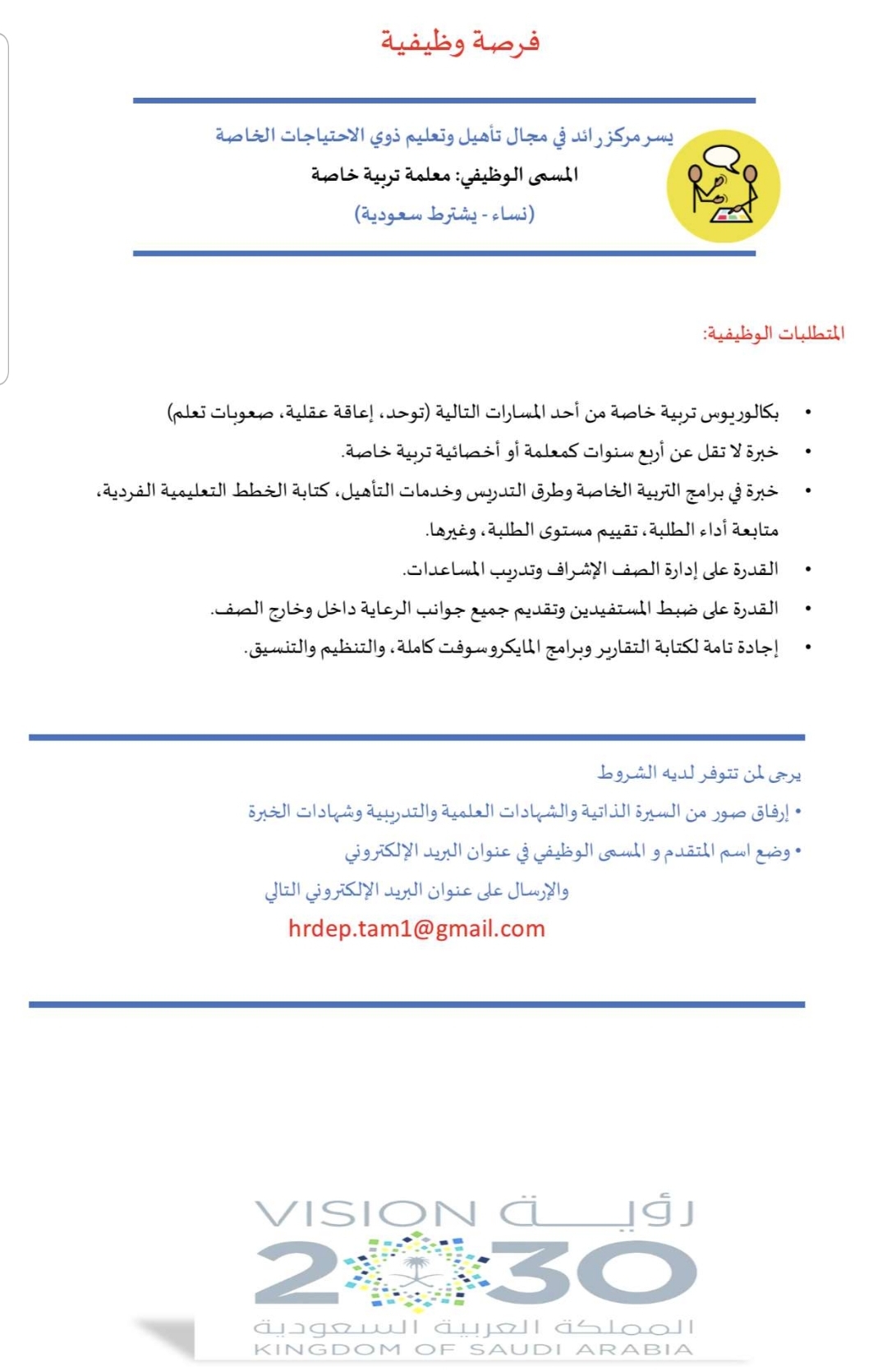 أعلن مركز يعمل في مجال تأهيل ذوي الاحتياجات الخاصة عن وظيفة بمسمى معلمة تربية خاصة ويشترط