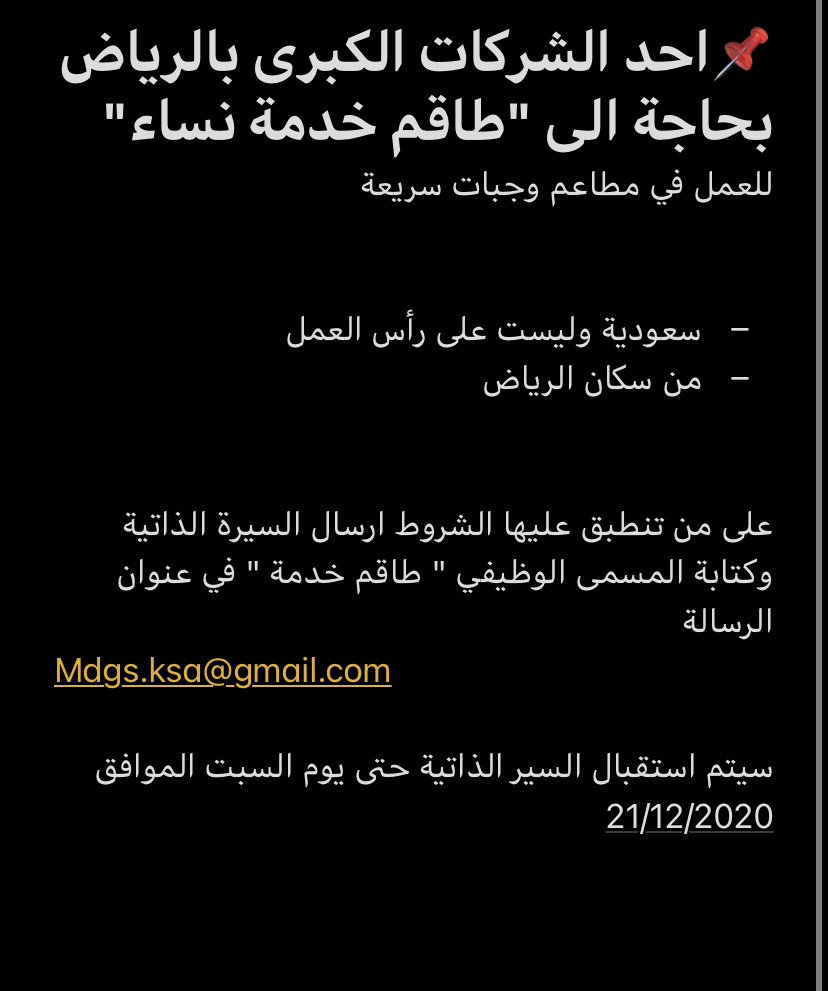 اعلنت احد الشركات الكبرى في الرياض عن وظائف بمسمى طاقم خدمة نساء
