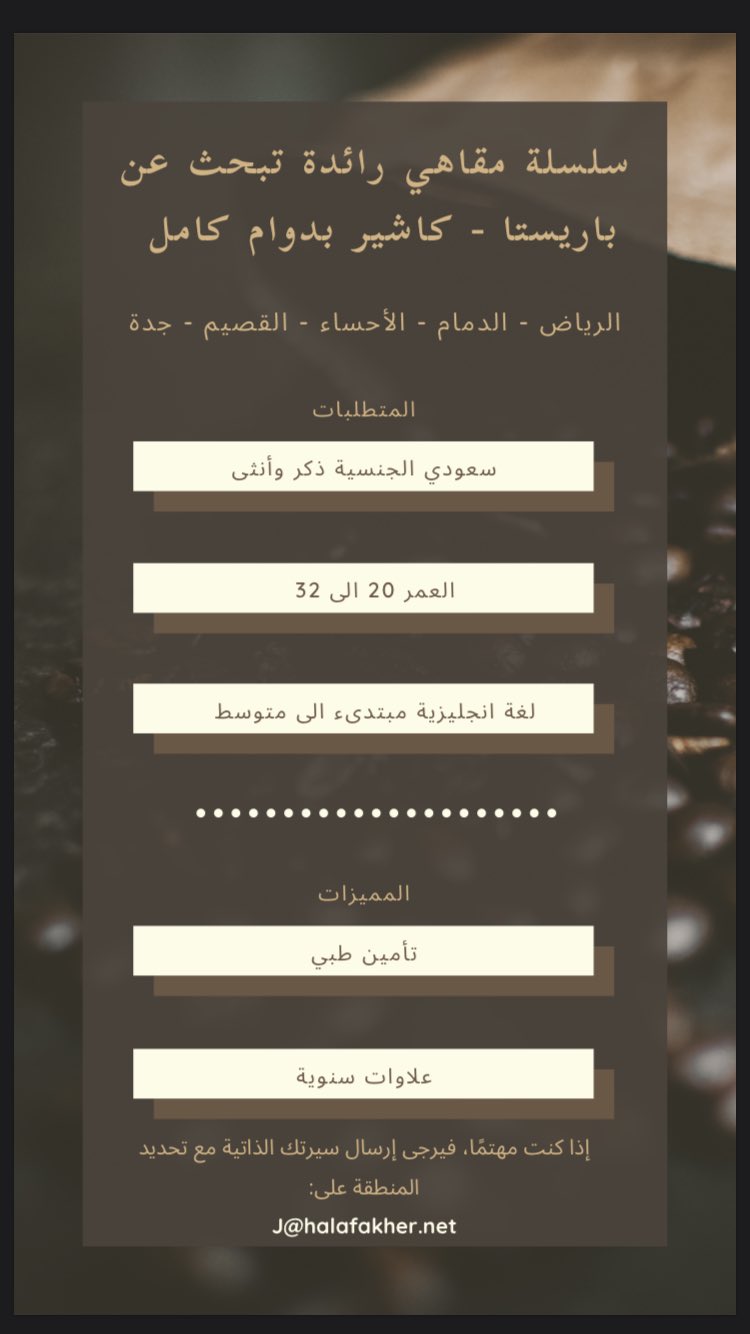 واحد من أشهر المقاهي يبحث عن باريستا وكاشير سعوديين من الجنسين