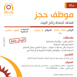 فندق اجنحة رتاج البيت في #مكة وظائف استقبال موظفي حجز ومشرفين ومتلقي طلبات وكاشير وإخرى