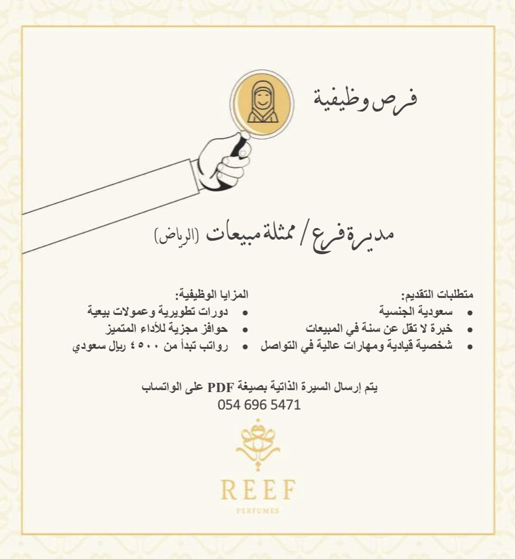 اعلنت ريف للعطور عن وظيفة نسائية بمسمى