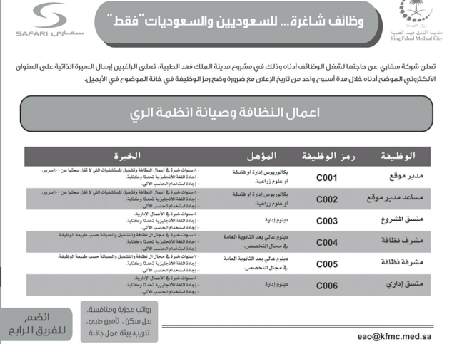 شركة سفاري مدير موقع ومساعد ومنسق مشروع ومشرف نظافة ومنسق إداري