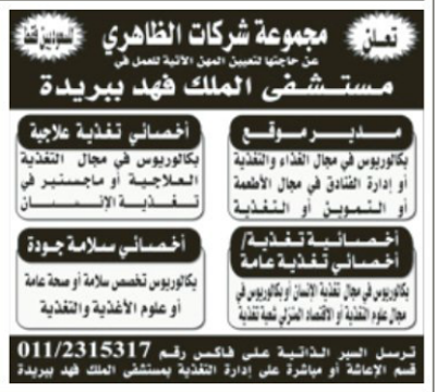مستشفى الملك فهد في #بريدة #القصيم وظائف مدير موقع واخصائي واخصائيه تغذية وسلامة جودة