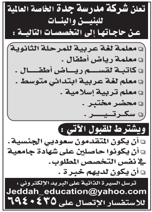 وظائف معلمات ومعلمين عربي ورياض اطفال وتربية اسلامية ومحضر مختبر وسكرتير وكاتبة #جدة