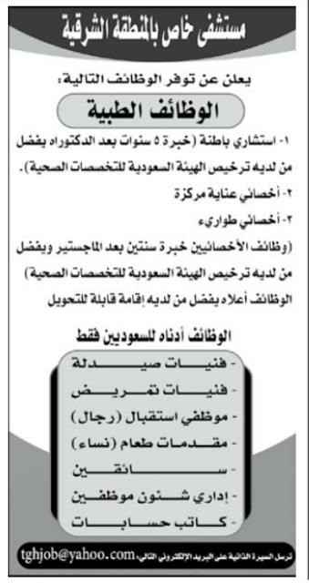 وظائف استشاريين واخصائيين واستقبال وفنيات تمريض وكاتب حسابات ومقدمات طعام في الشرقية