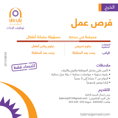 وظائف نسائية في #الخرج ممرضة ومسؤولة حضانة اطفال