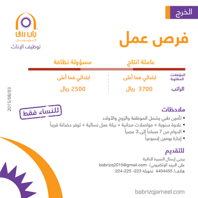 وظائف نسائية في #الخرج عاملات انتاج ومسؤولات تنظيف لحملة الابتدائي
