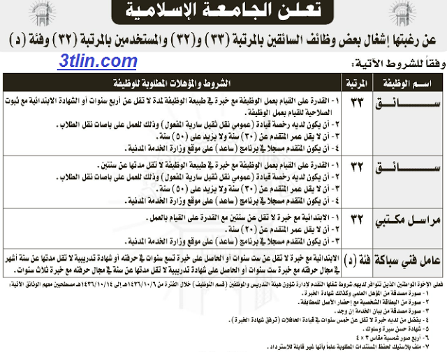 الجامعة الاسلامية في #المدينة المنورة وظائف سائقين بالمرتبة 33 و 32 ومراسل مكتبي وفني سباكه.