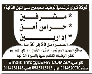 وظائف مشرفين وحراس امن وإداريين في #الرياض #حائل #الخرج و وادي الدواسر