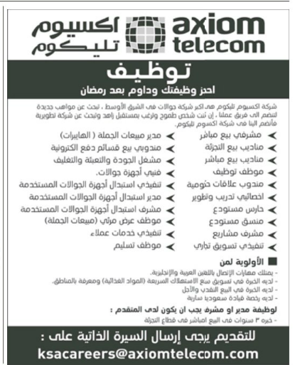 اكسيوم تليكوم وظائف بأعداد كبيرة ووظائف منوعه