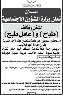 وزارة الشؤون الاجتماعية طباخ وعامل طبخ في #حدة #مكة #الاحساء #بريدة #عنيزة #الجوف #المدينة #حائل