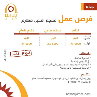 منتجع النخيل مكارم كاشير ومساعد طاهي ومقدمي طعام رواتب 6000 ريال في #جدة