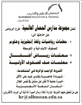 وظائف معلمات في الرياض في مدارس الحصان العالمية
