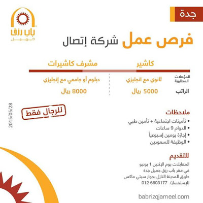 شركة اتصال وظائف في #جدة كاشير ومشرف كاشيرات رواتب حتى 8000 ريال