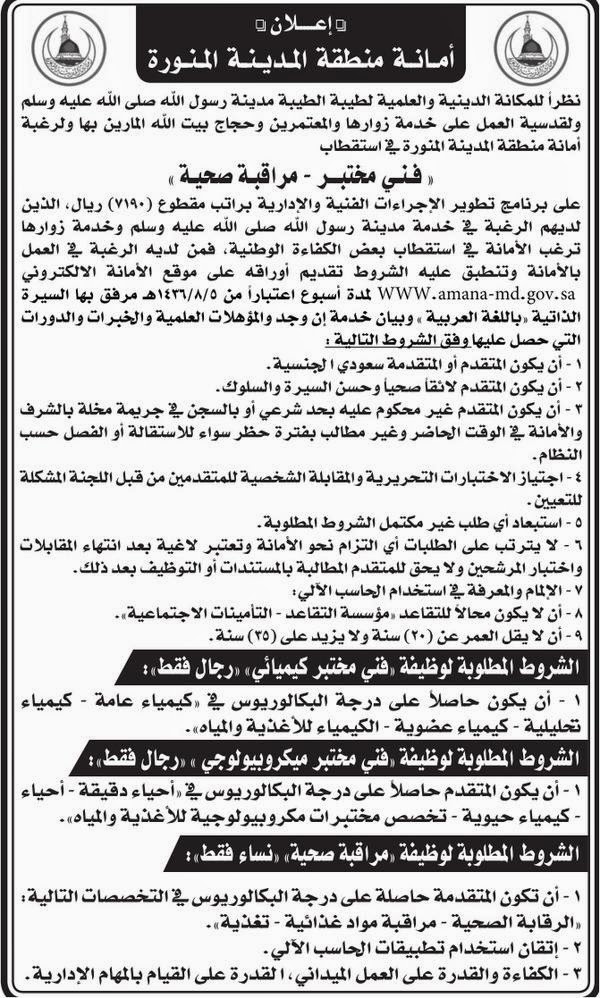 امانة المدينة وظائف فنيين مختبر ومراقبة صحية برواتب 7190 ريال مقطوعه