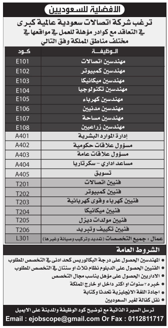 وظائف #مهندسين وموارد وتسويق وفنيين وعمال في شركة اتصالات في غالبية المناطق