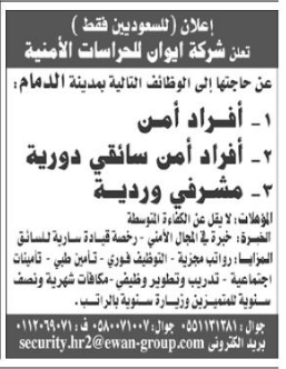 شركة ايوان للحراسات الامنية سائقين دوريات ومشرفي وردية وافراد امن في #الدمام