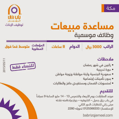 وظائف نسائية في #مكة مساعدة مبيعا تفي وظائف موسمية