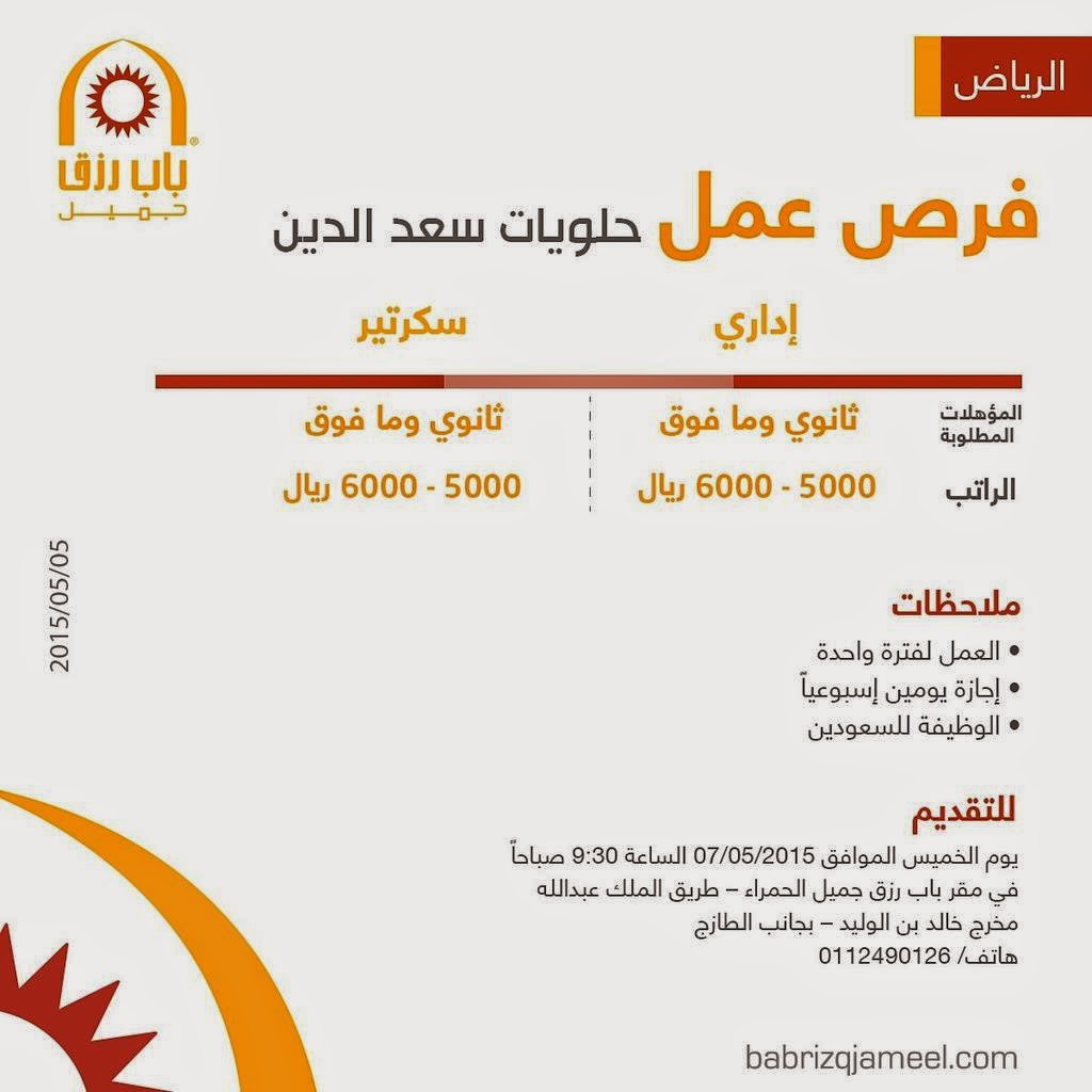 وظائف في #الرياض حلويات سعد الدين إداريين وسكرتير